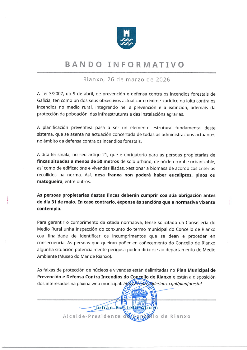 - Bando informativo sobre a limpeza de faixas de protección forestal - Concello de Rianxo