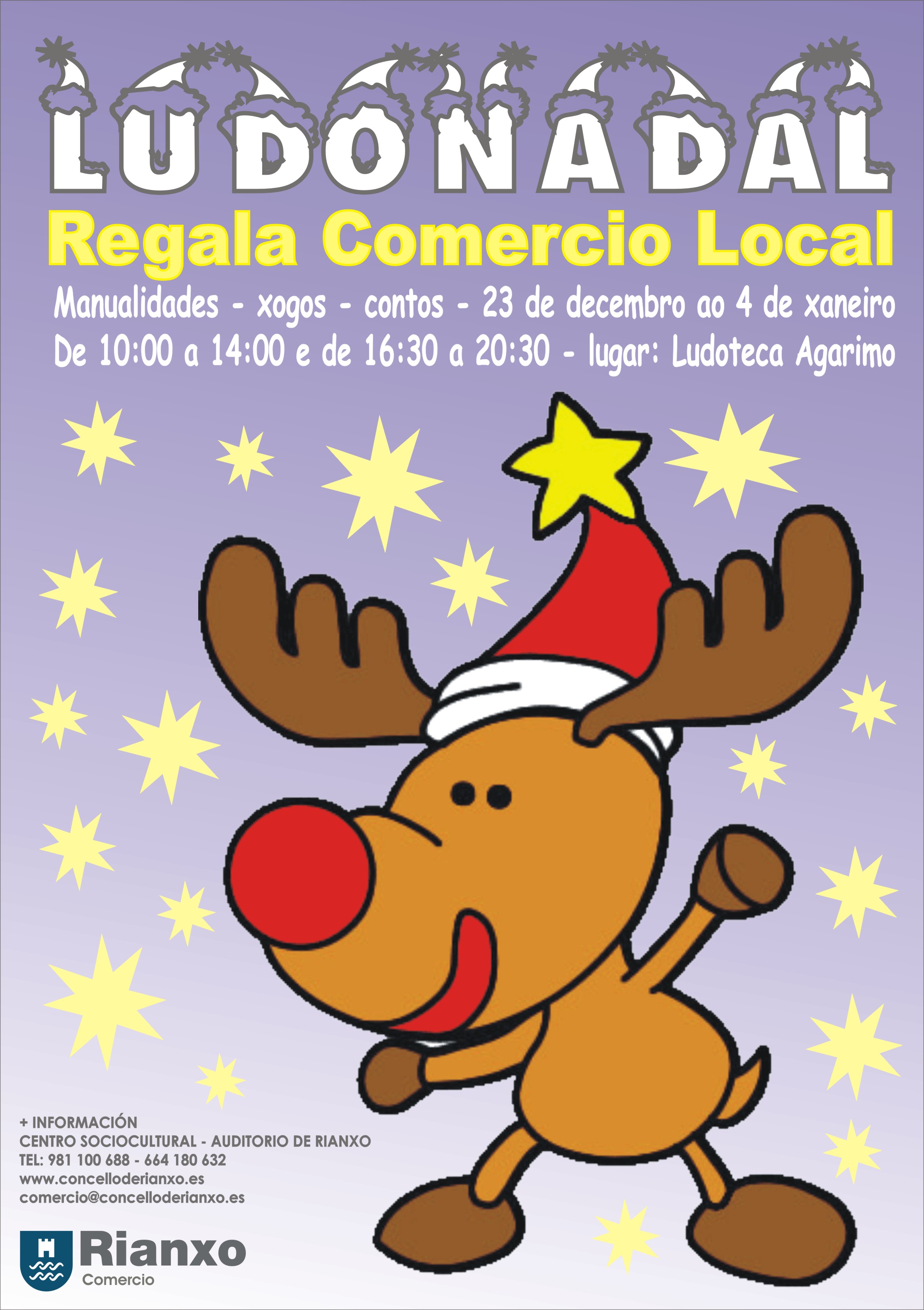 Mentras realizas as túas compras, poderás deixar aos nenos e nenas entreténdose na Ludonadal, onde realizarán manualidades, contos, xogos e moitas outras sorpresas. A actividade desenvolveráse os días 23,24, 26, 27, 28, 30 e 31 de decembro e o 2, 3 e 4 de xaneiro en horario de 10:00 a 14:00 horas e de 16:30 a 20:30 (agás o 24 e 31 que pechará as 19:00), e está dirixira a nenos e nenas de 3 a 12 anos. O lugar onde se desenvolveran as actividades será a Ludoteca Agarimo, situada na Rúa dos Mestres (Rianxo).