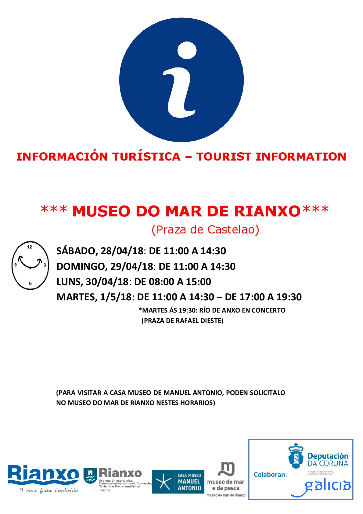 O servizo de información turística estará dispoñible no Museo do Mar de Rianxo, do 28 de abril ao 1 de maio de 2018, no horario que se indica máis abaixo.