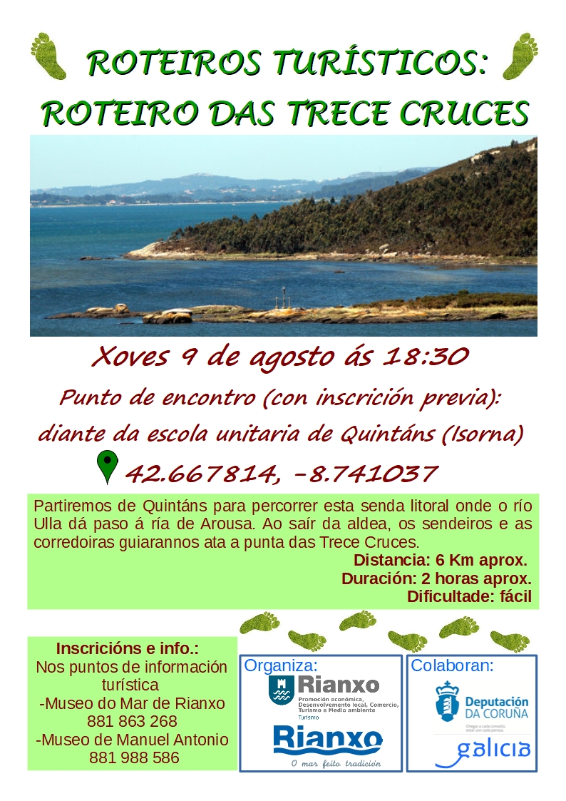 Partiremos de Quintáns (Isorna - Rianxo), de diante da escola unitaria de Quintáns. Aproveitade a ocasión para coñecer connosco esta zona da desembocadura do río Ulla, onde se forma a ría de Arousa, con vistas aos concellos pontevedreses de Catoira e Vilagarcía ou á illa de Cortegada, do Parque Nacional das Illas Atlánticas de Galicia. Os sendeiros e as corredoiras guiarannos ata a punta das Trece Cruces, acompañados por vexetación tanto autóctona coma foránea.