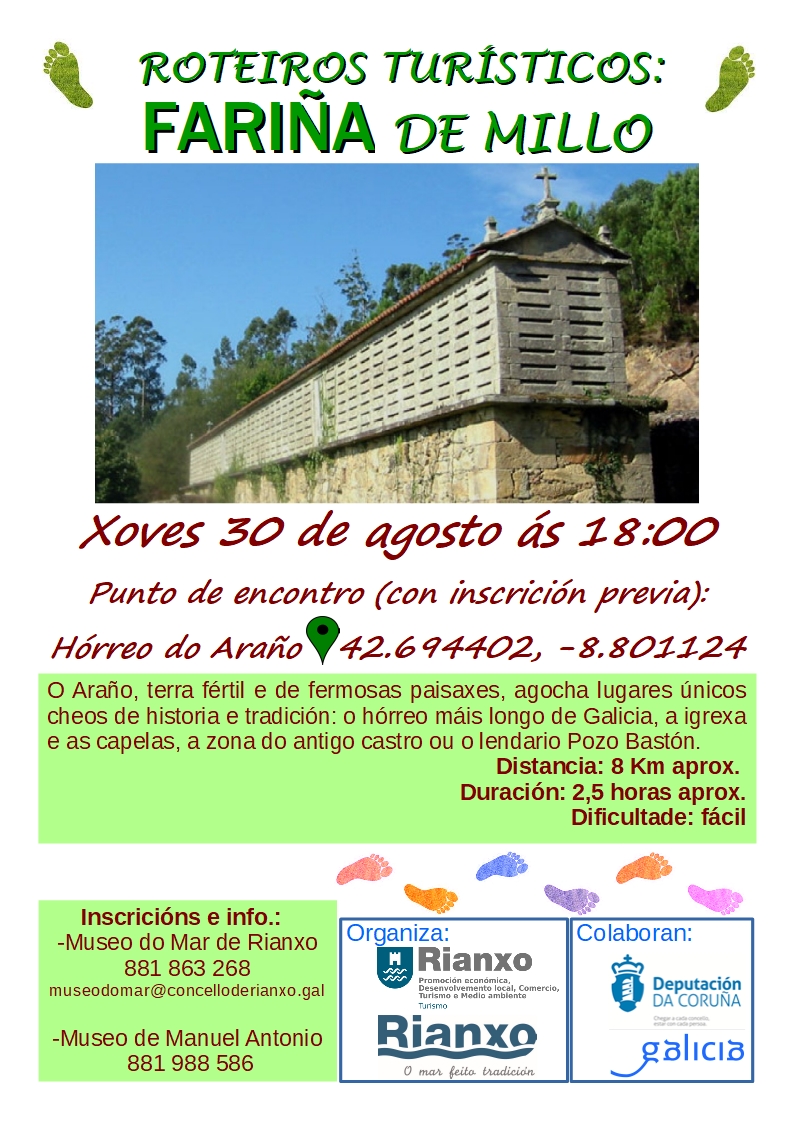 Chegamos xa á quinta ruta guiada, que terá lugar o xoves 30 de agosto: Fariña de millo. Para participar, cómpre anotarse nos puntos de información turística.